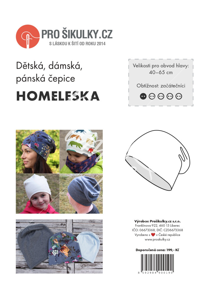 Střih na čepici homelesku je zpracovaný v profesionálním programu pro konstrukci střihů a je vyvedený ve velikostech 0–99 let.