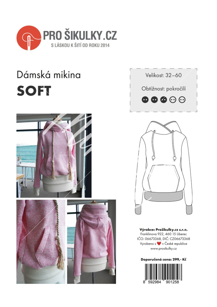 Dámská mikina SOFT je jednoduchého lehce projmutého střihu s nakládanou kapsu v předním dílu (klokankou) a kapucí do límce se stahováním na šňůrku. Rukávy jsou klasické, hlavicové, zakončené širokými náplety stejně jako spodní lem mikiny.