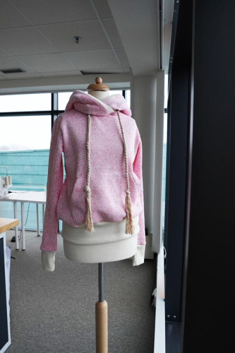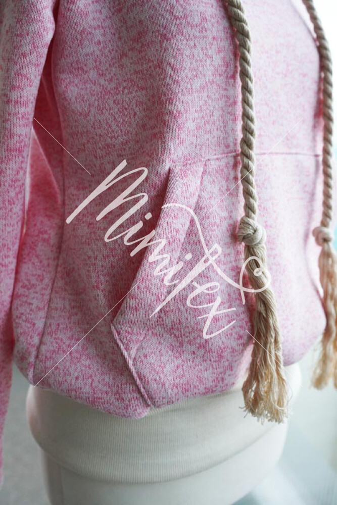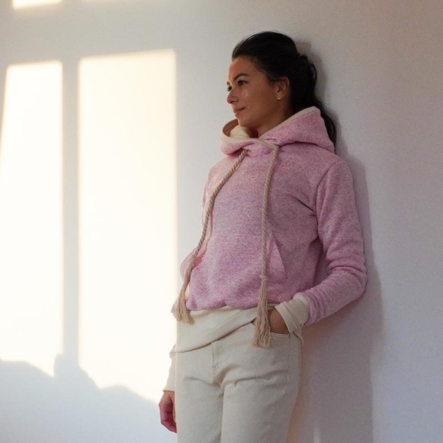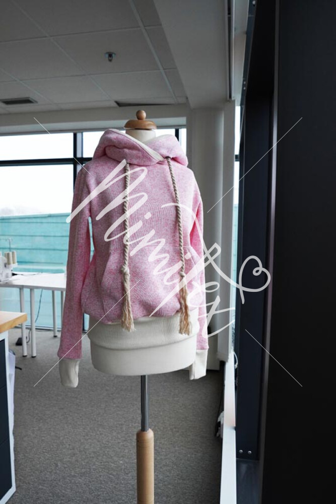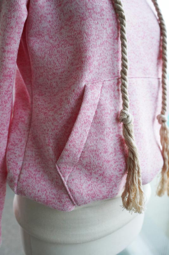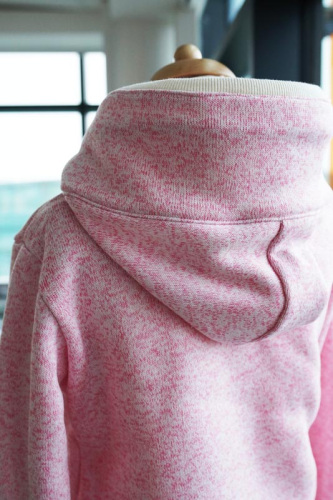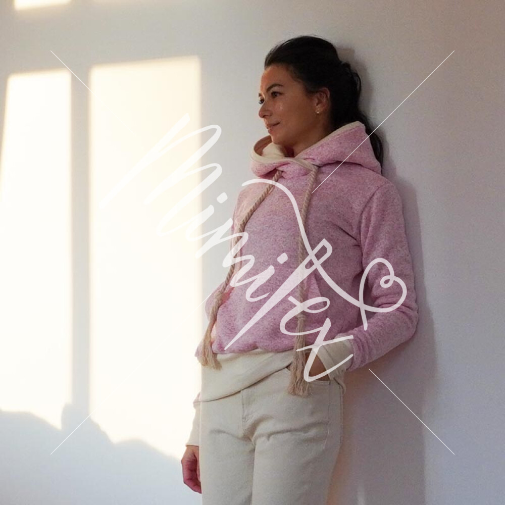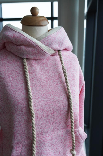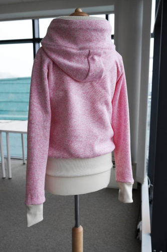 Střih na dámskou mikinu je vhodný pro silné méně pružné pleteniny, jako je např. elastický fleece, fleecová svetrovina, silná počesaná teplákovina apod.