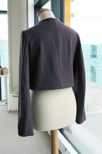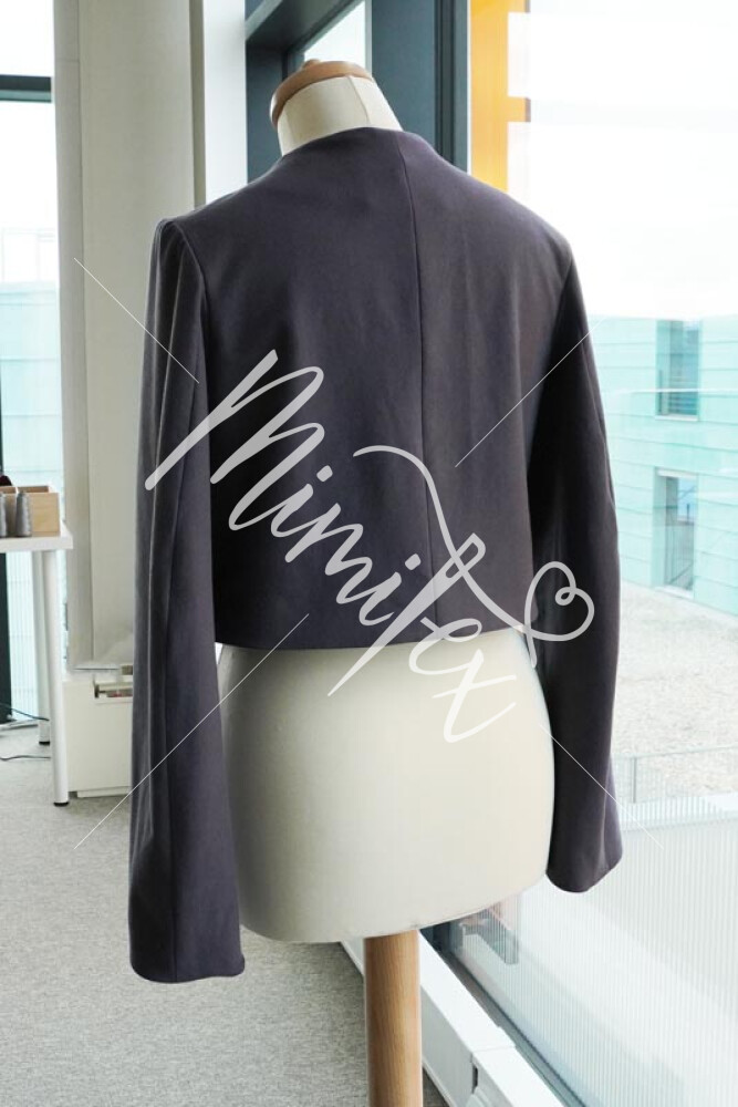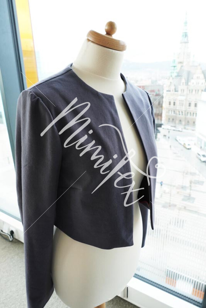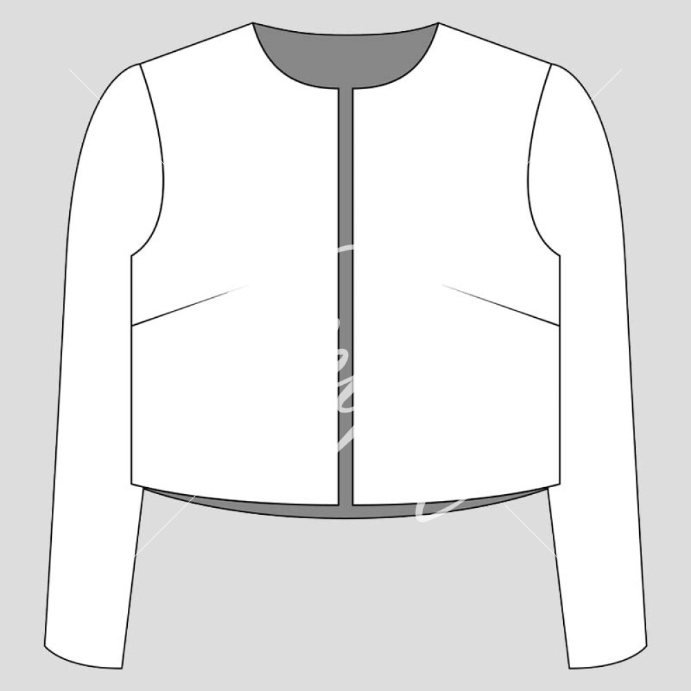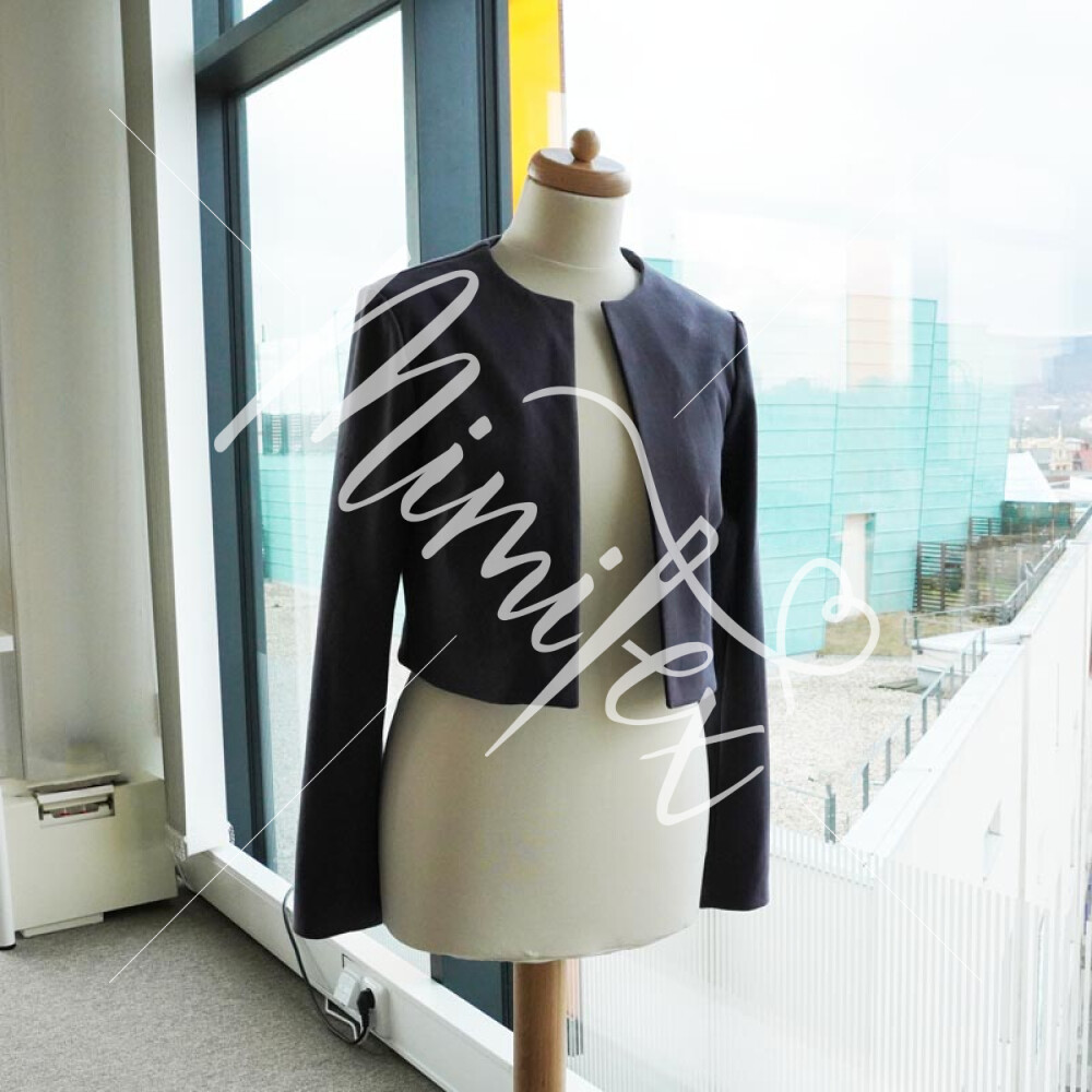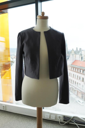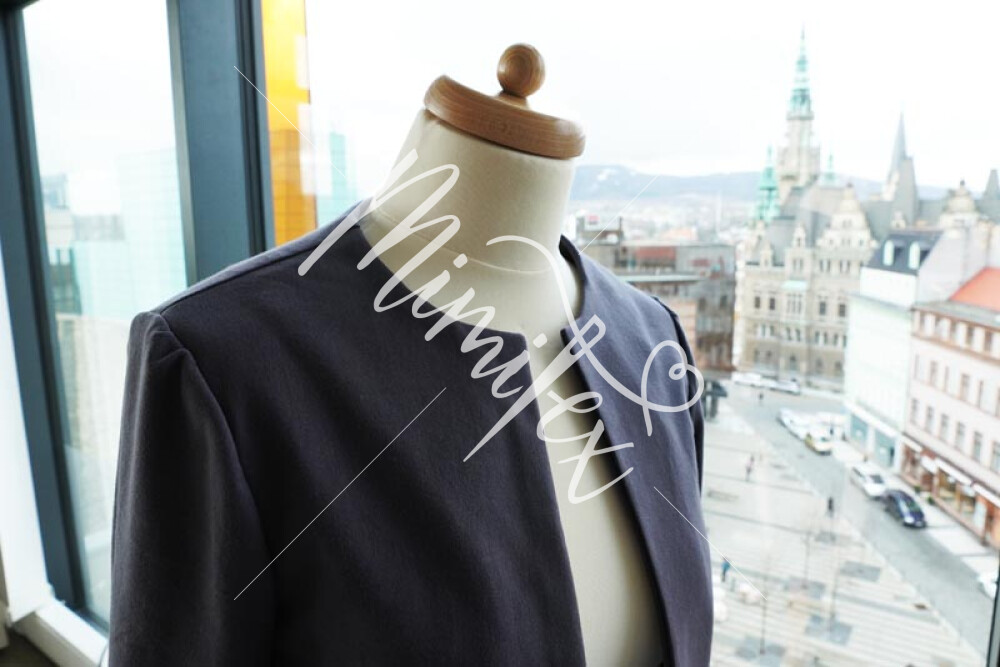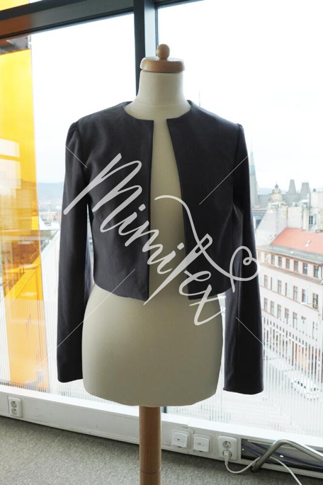 Jednoduché dámské sako rovného střihu s prsními záševky. Živůtek v délce do pasu. Elegantní kulatý výstřih, díly zakončené podsádkami.