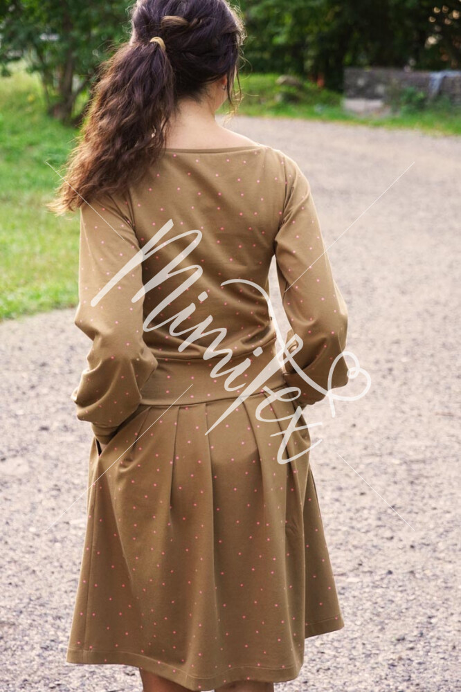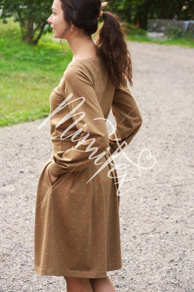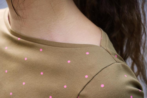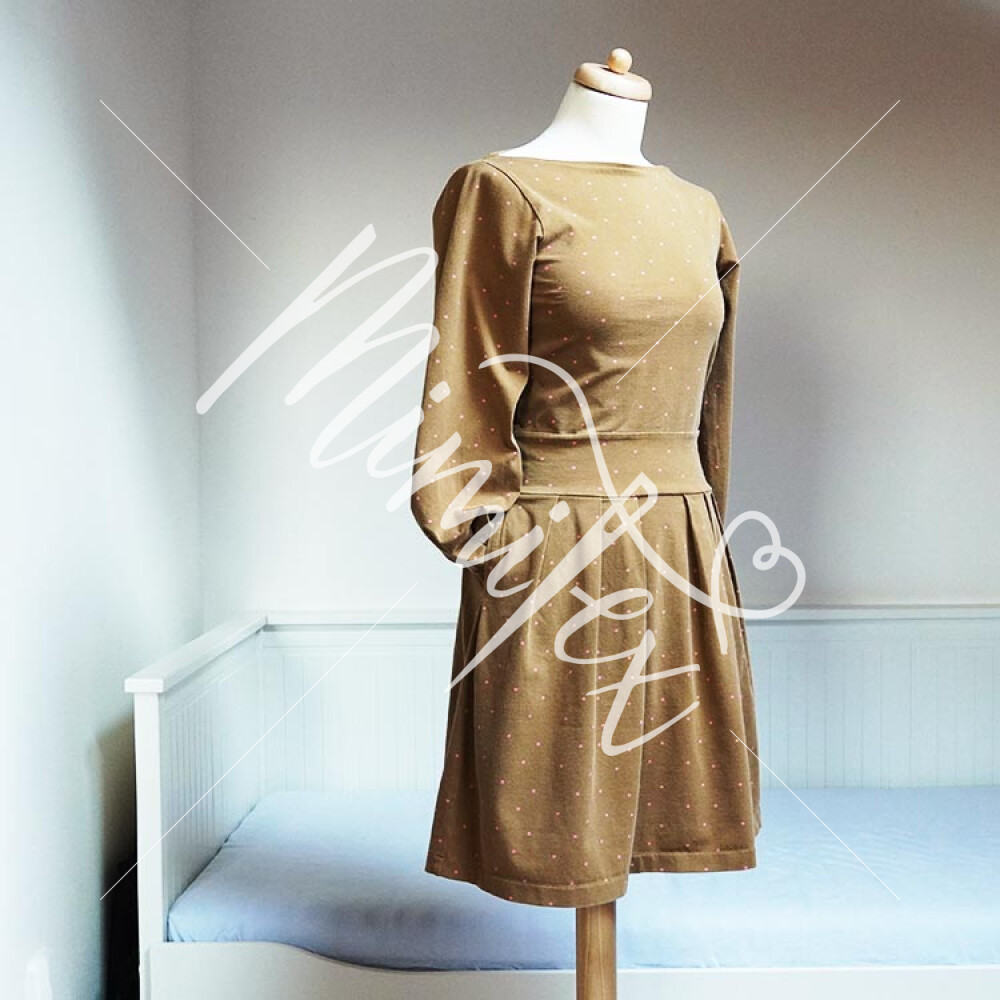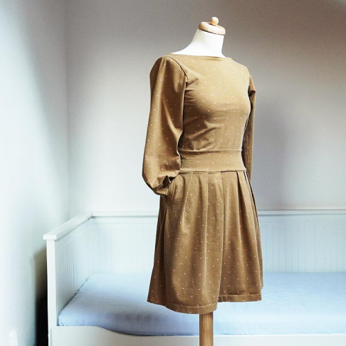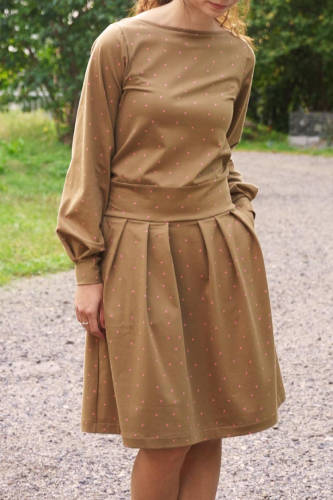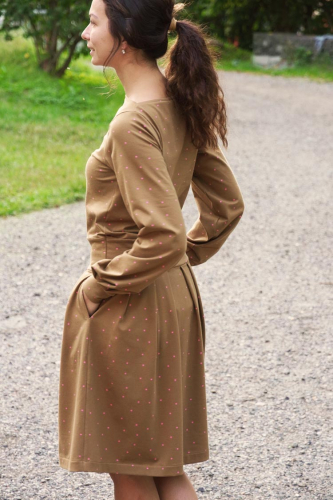 Střih na dámské šaty je konstruovaný pro středně silné pleteniny. Ideální volbou bude silnější bavlněný úplet s elastanem v gramáži kolem 210 g/m2. Dále na šití šatů můžete použít například slabší nepočesanou teplákovinu s elastanem, úplet typu punto di roma apod. Šaty na fotkách jsou ušité z bavlněného úpletu (95% bavlna, 5% elastan) v gramáži 215 g/m2.