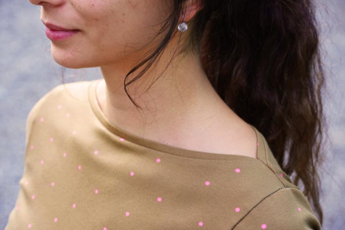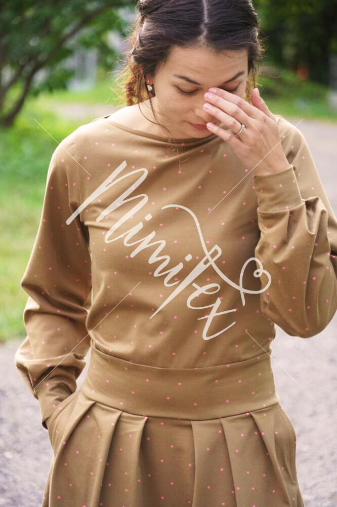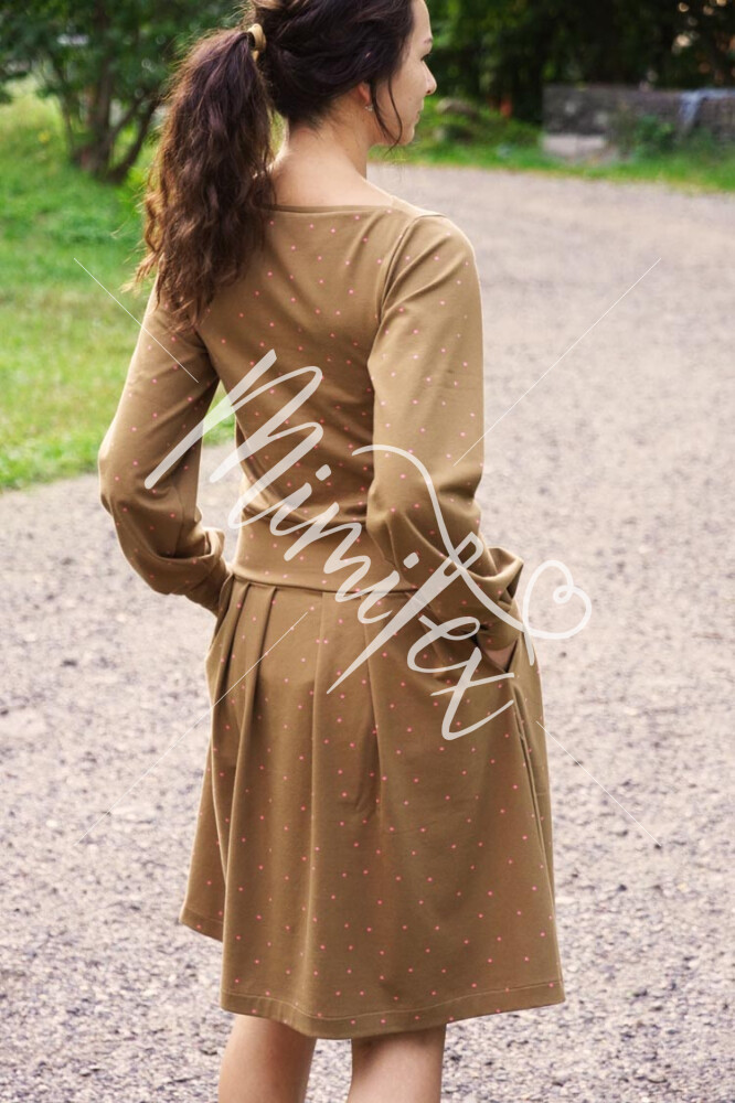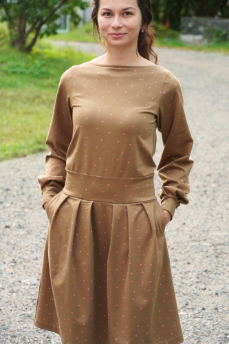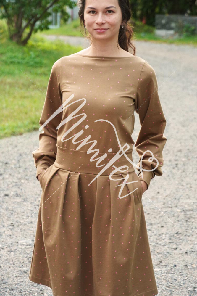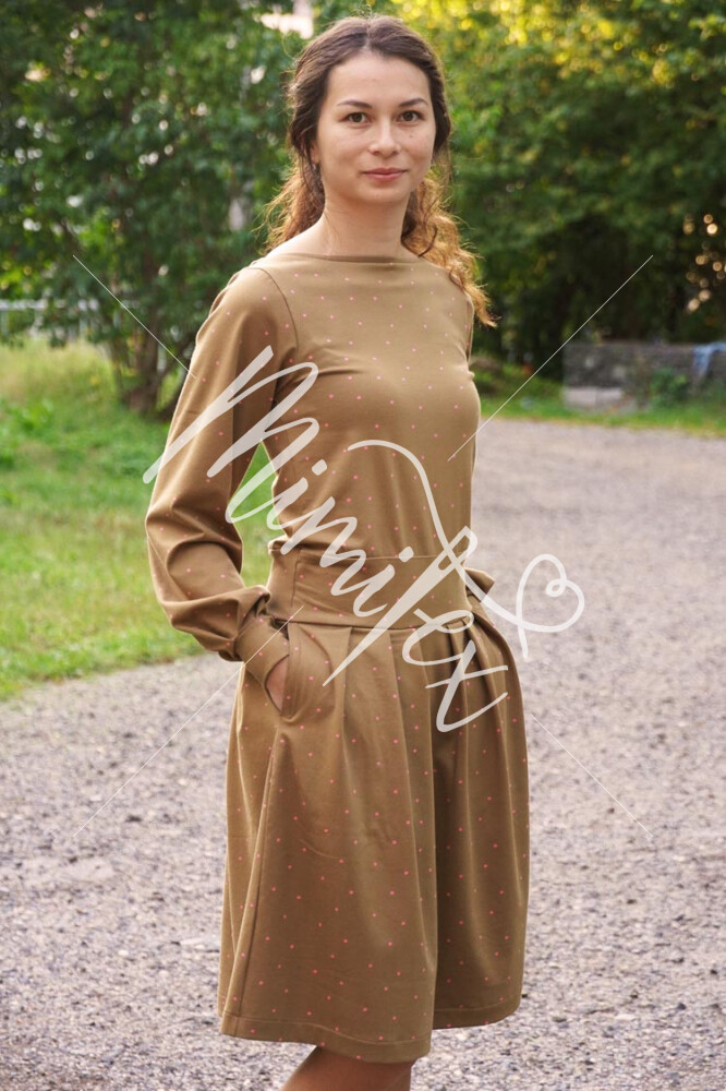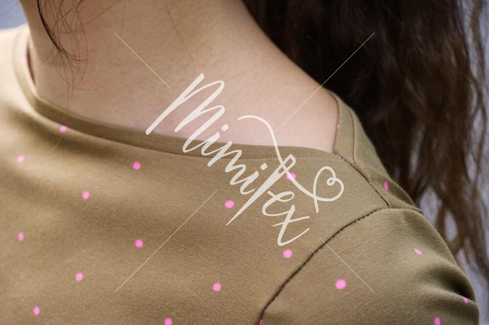 Střih na dámské šaty je konstruovaný pro středně silné pleteniny. Ideální volbou bude silnější bavlněný úplet s elastanem v gramáži kolem 210 g/m2. Dále na šití šatů můžete použít například slabší nepočesanou teplákovinu s elastanem, úplet typu punto di roma apod. Šaty na fotkách jsou ušité z bavlněného úpletu (95% bavlna, 5% elastan) v gramáži 215 g/m2.