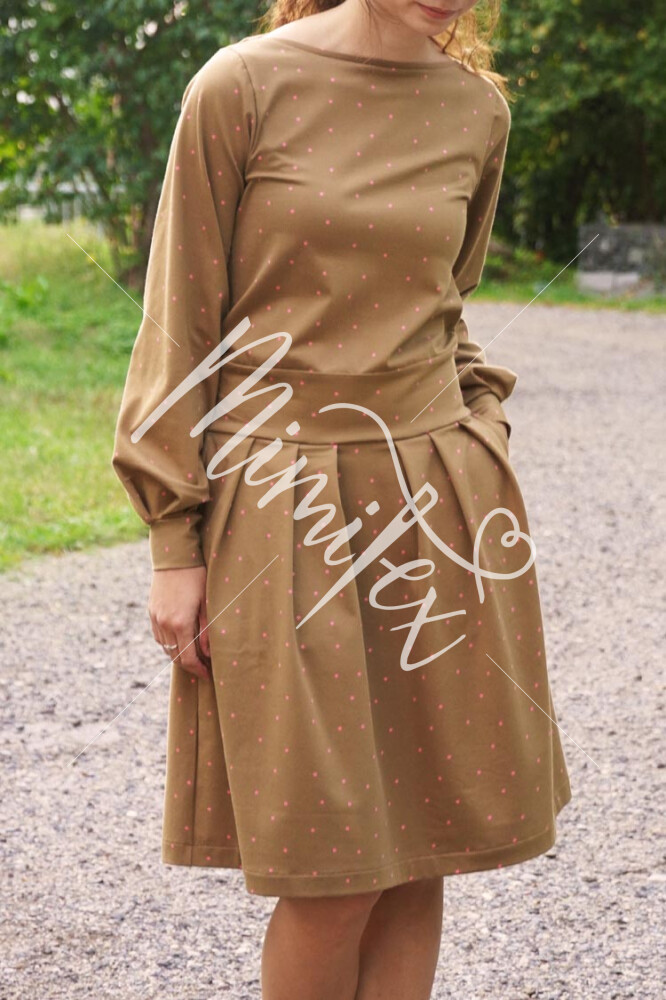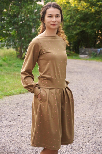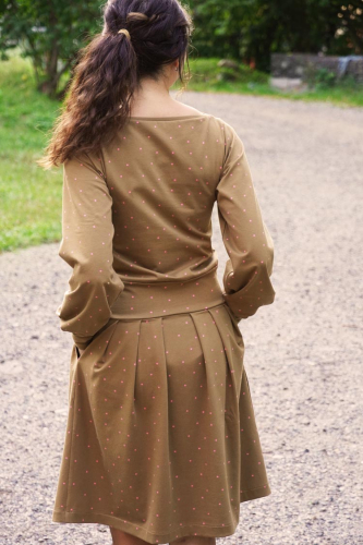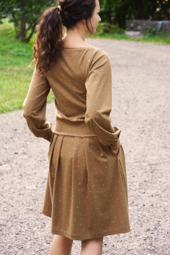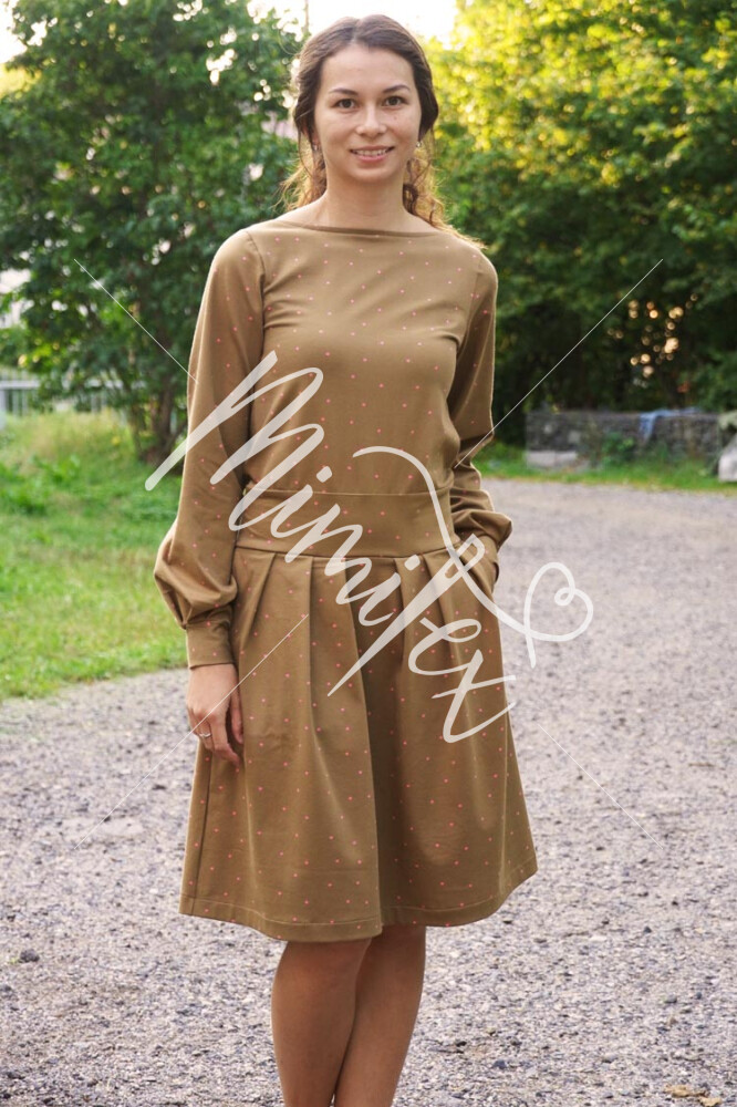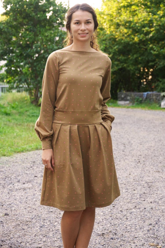 Střih na dámské šaty je v živůtku polopřiléhavé siluety, s volnými rukávy staženými do manžety z nápletu nebo širokého pruhu úpletu. Šaty mají středně bohatou sukni se sklady v předním i zadním dílu.