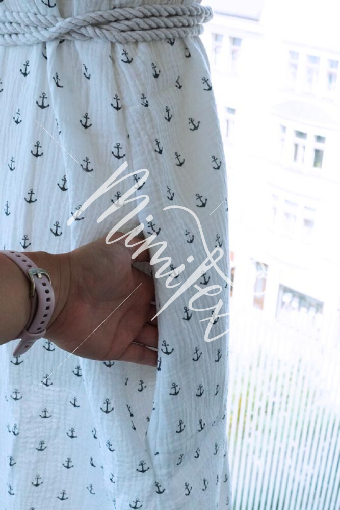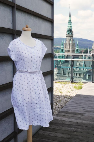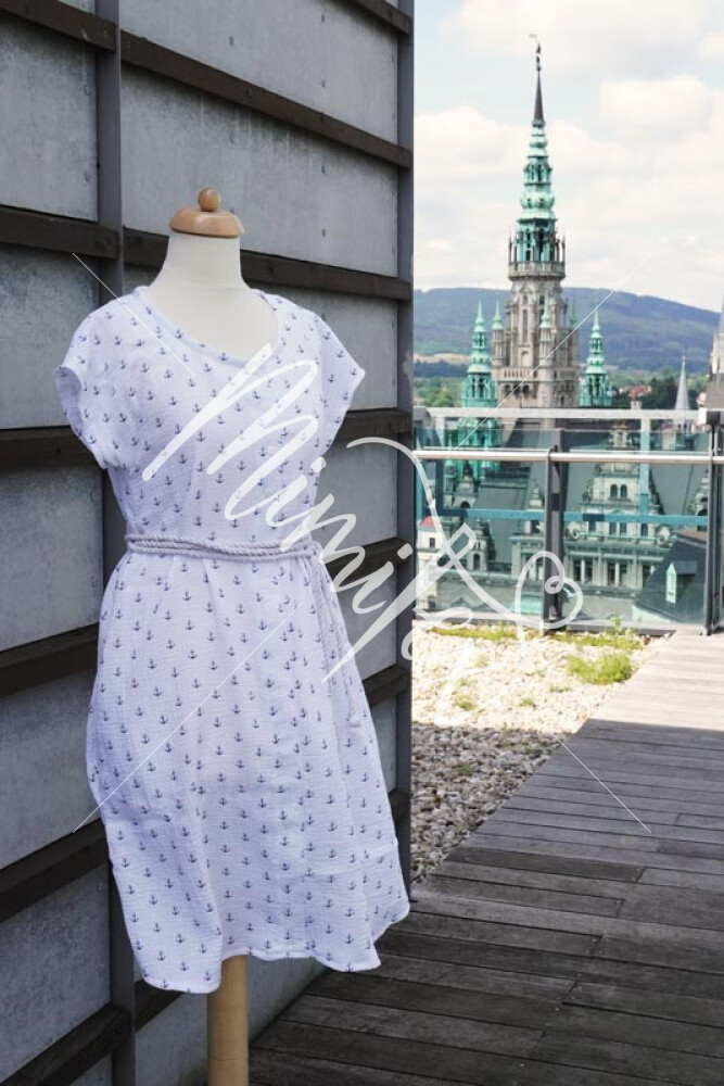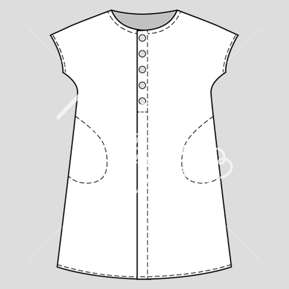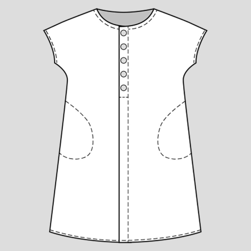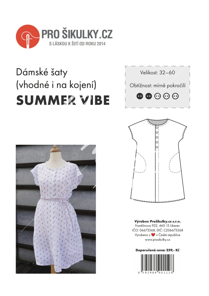 Dámské letní šaty jsou jednoduchého áčkového střihu s přinechanými rukávy a kapsami v bočních švech. V předním dílu je zapínání na knoflíčky nebo druky a šaty jsou tak vhodné i i jako kojící. Střih na dámské šaty je zpracovaný v profesionálním konstrukčním programu pro dámské velikosti 32–60.