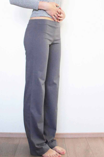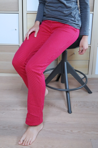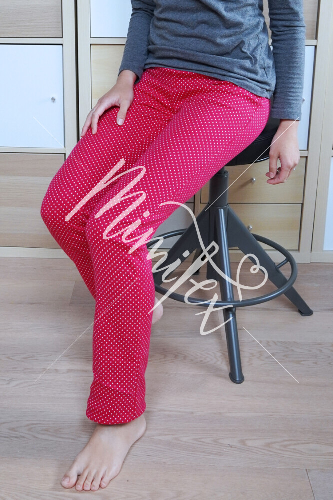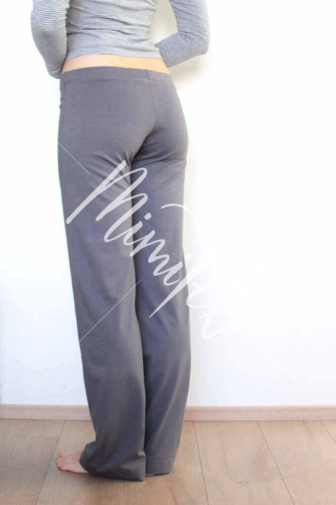 Domácí, pyžamové, fitness tepláky jsou nadčasového rovného střihu. Bez kapes, bez sedel a jiného členění. Dámské tepláky jsou tak velmi pohodlné a jsou proto vhodné nejen na doma, ale i na cvičení nebo na spaní. V pase je v tunýlku vložena široká guma.