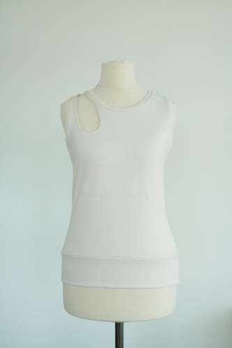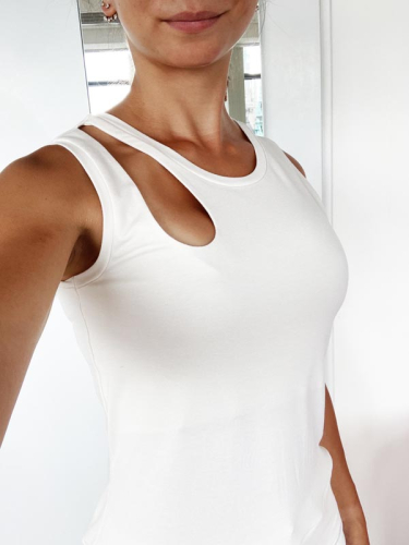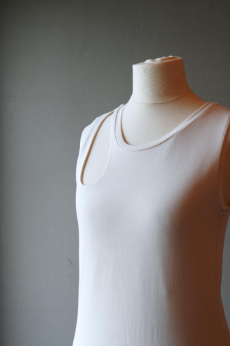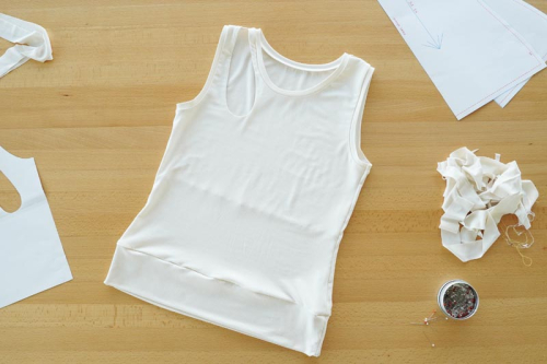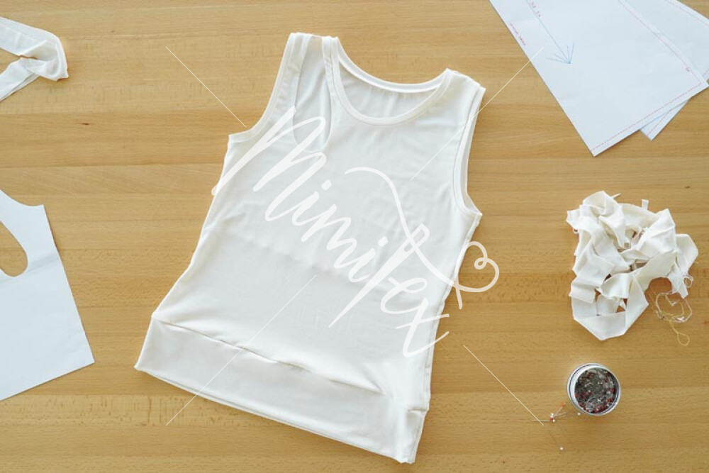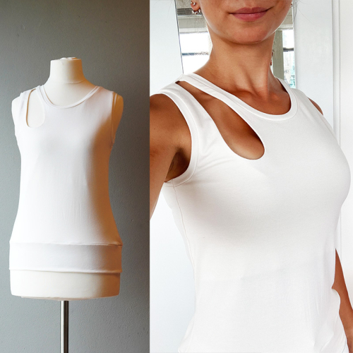 Střih na dámské tílko je vhodný pro slabší pleteniny, např. bavlněný nebo viskózový úplet s elastanem apod.