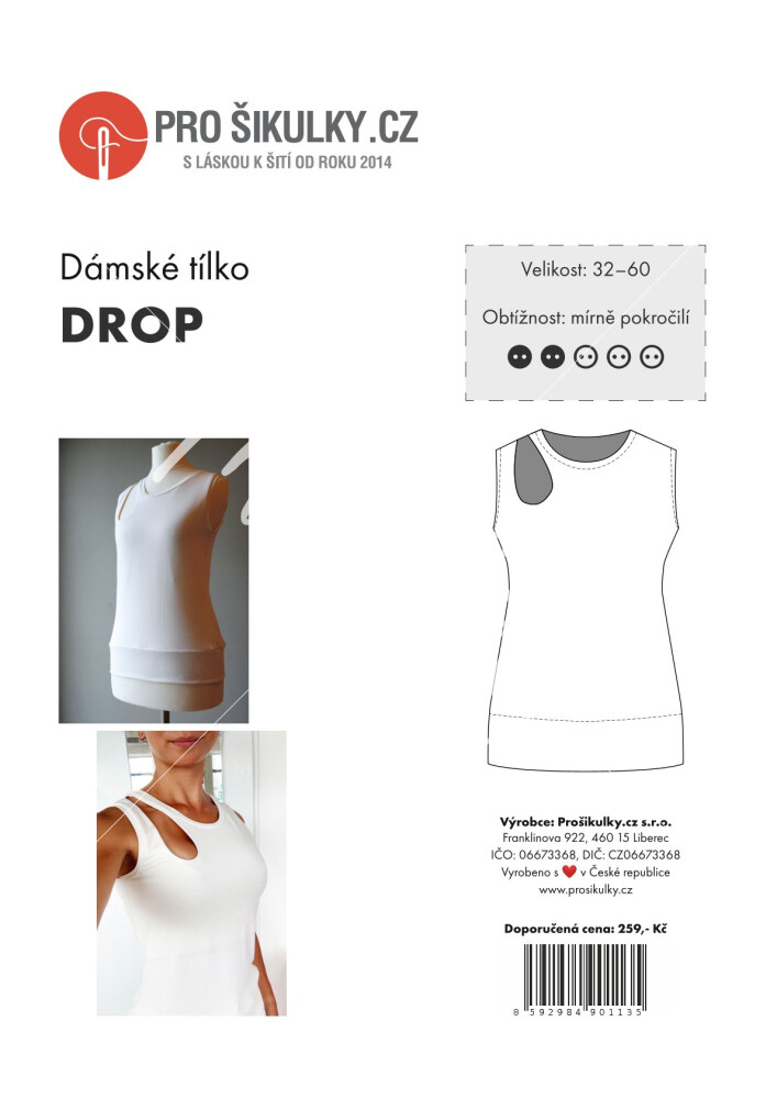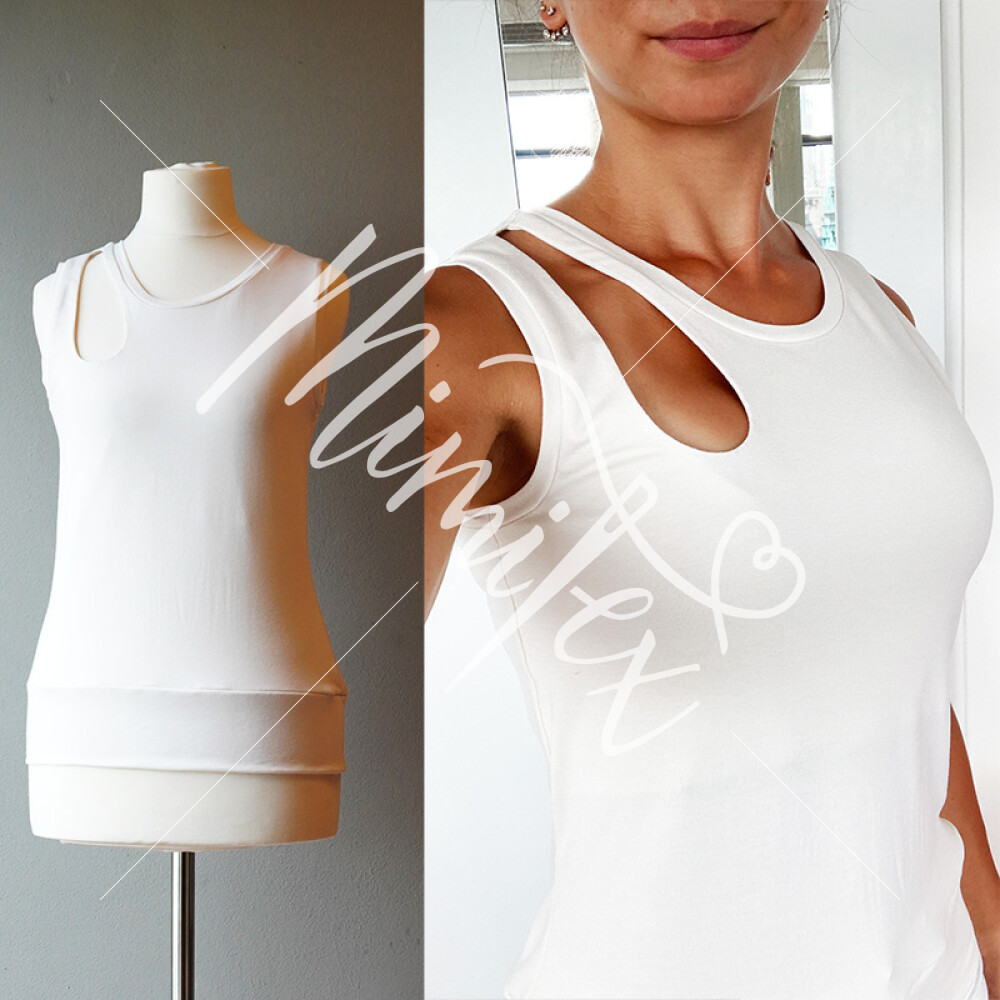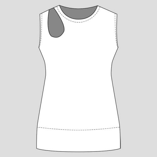 Střih na dámské tílko s průstřihem ve výstřihu ve tvaru kapky. Střih na dámské tílko je zpracovaný v profesionálním programu pro konstrukci střihů a je vyvedený ve velikostech 32–60.
