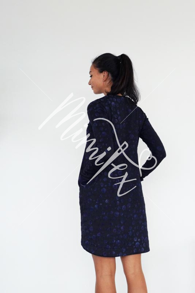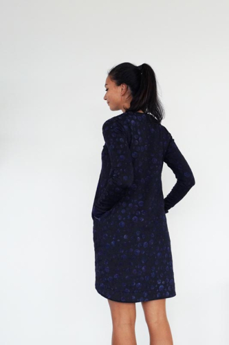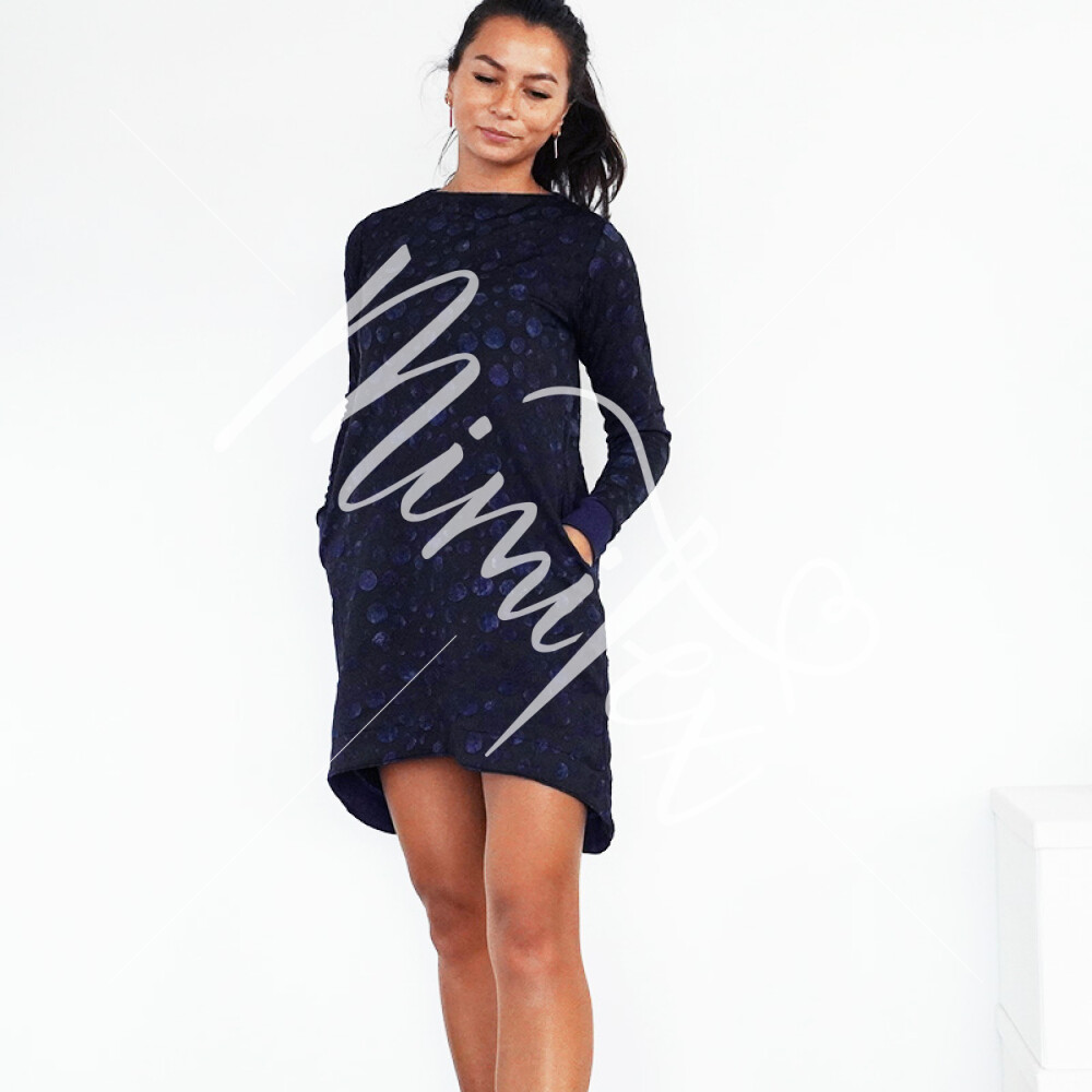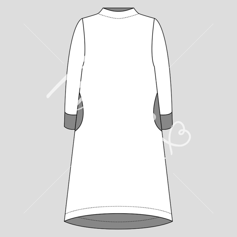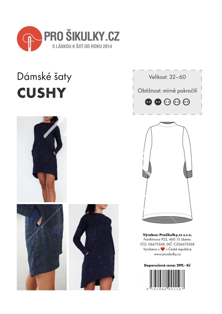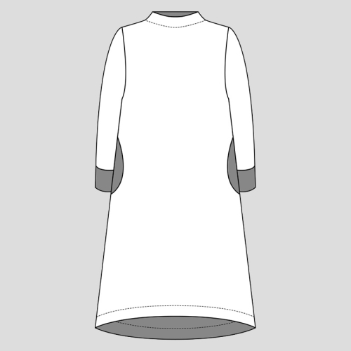 Šaty jsou jednoduchého mírně áčkového střihu s přinechaným nízkým stojáčkem. Šaty mají dlouhé rukávy zakončené lemy, kulaté kapsy v bočních švech a volnou siluetu bez prsních záševků. Střih na dámské volné šaty je zpracovaný v profesionálním konstrukčním programu pro dámské velikosti 32–60.