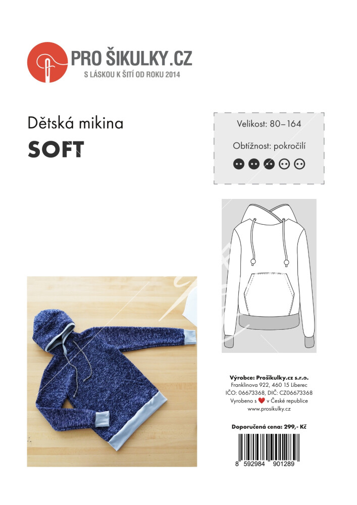 - Dětská mikina SOFT je jednoduchého rovného střihu s nakládanou kapsu v předním dílu (klokankou) a kapucí do límce se stahováním na šňůrku. Rukávy jsou klasické, hlavicové, zakončené širokými náplety stejně jako spodní lem mikiny.