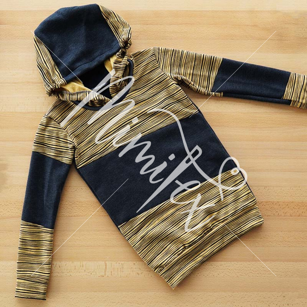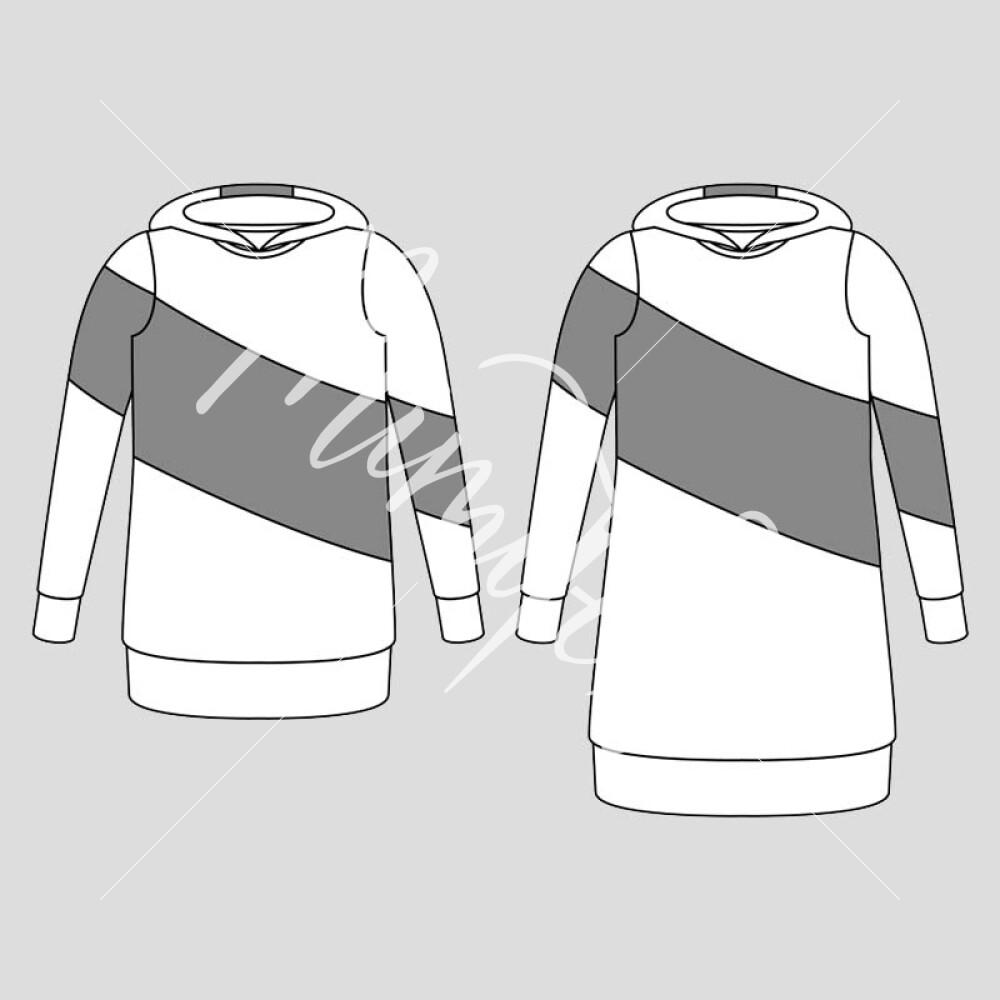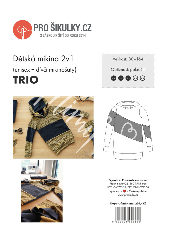 - Dětská mikina TRIO je pohodlného rovného střihu. Mikina (mikinové šaty) má členěný přední díl, oba rukávy i kapuci.