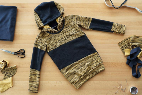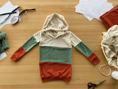 Střih je zpracovaný pro středně silné pleteniny. Vhodná je například slabší nepočesaná teplákovina s elastanem, úplet typu French Terry nebo Punto di Roma apod.