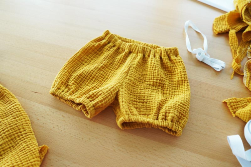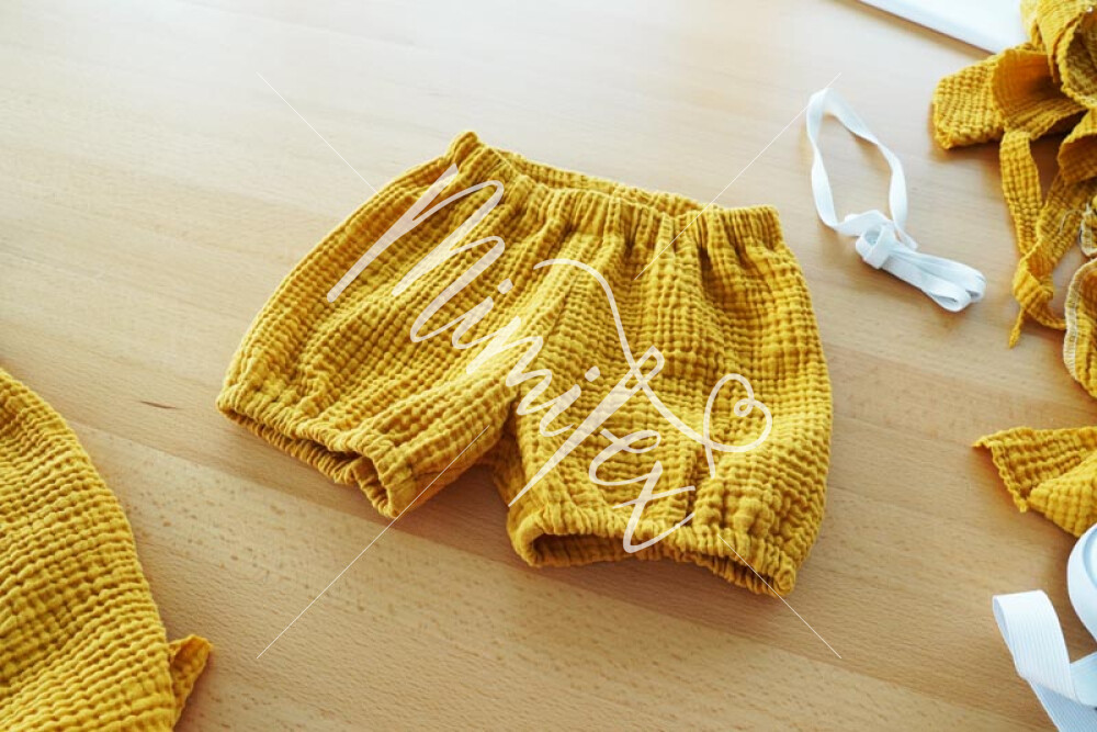 Střih na dětské pumpky je vhodný pro slabší měkké tkaniny, ideální je např. mušelín (dvojitá nebo trojitá gázovina) apod.