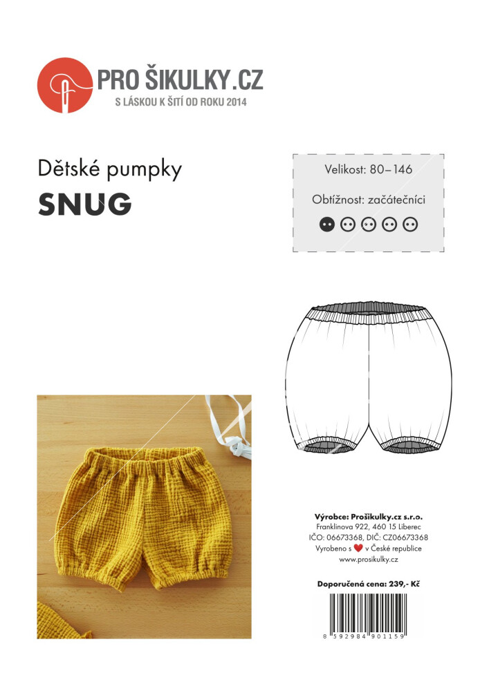 - Dětské pumpky SNUG jsou volného velmi pohodlného střihu. V pase i nohavičkách jsou stažené pruženkou. Pas i nohavičky je případně možné všít do nápletu. Střih na dětské pumpky je zpracovaný v profesionálním konstrukčním programu pro dětské velikosti 80–146.