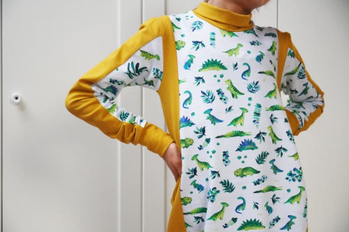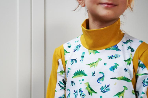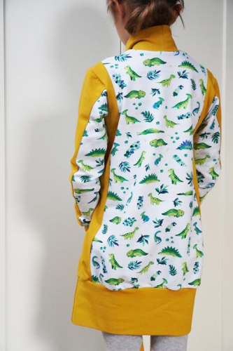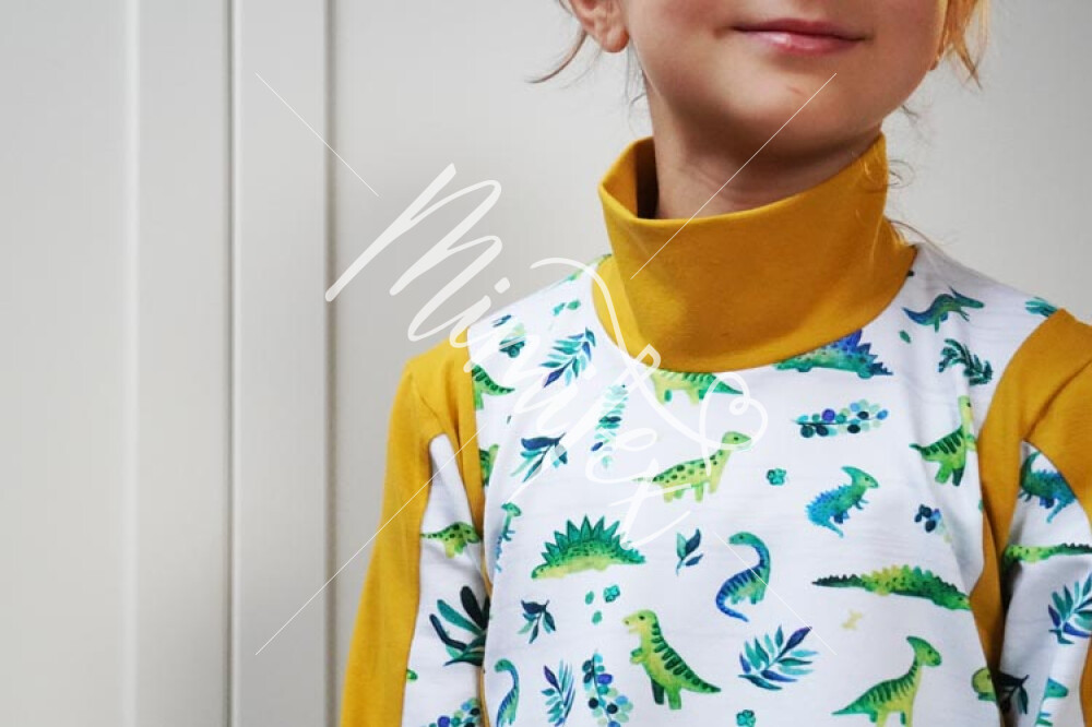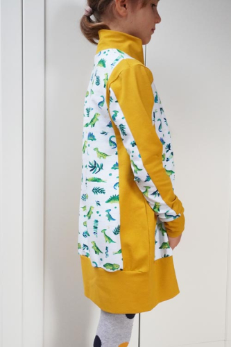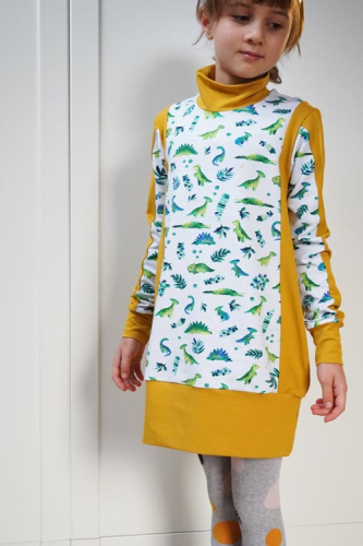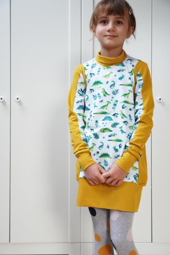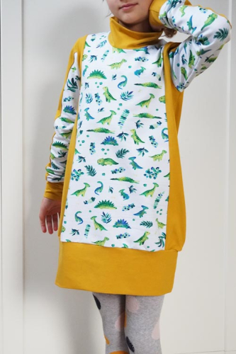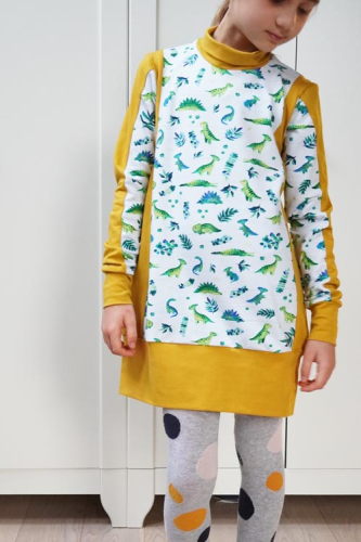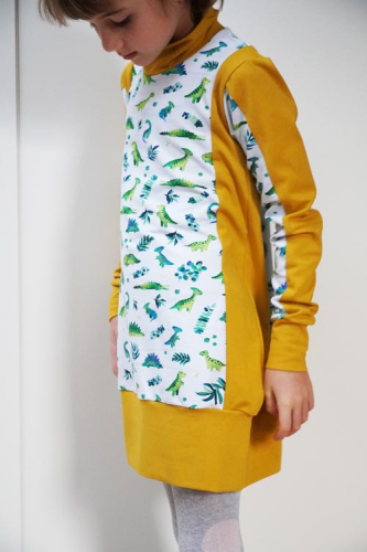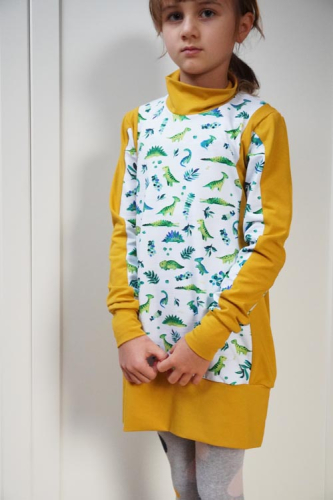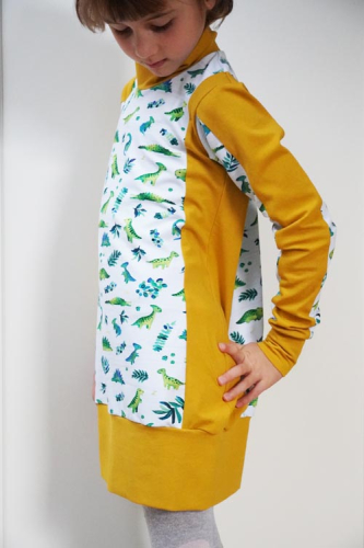 Střih na dětské šaty je vhodný pro středně silné pleteniny, např. elastická teplákovina, úplet French Terry apod.