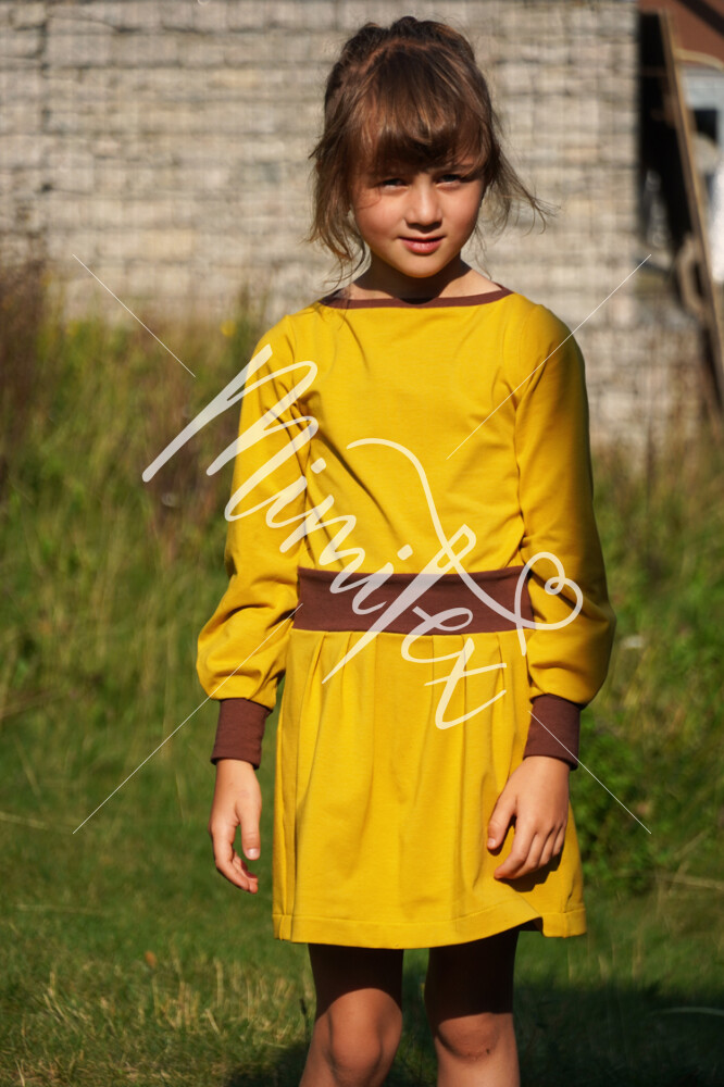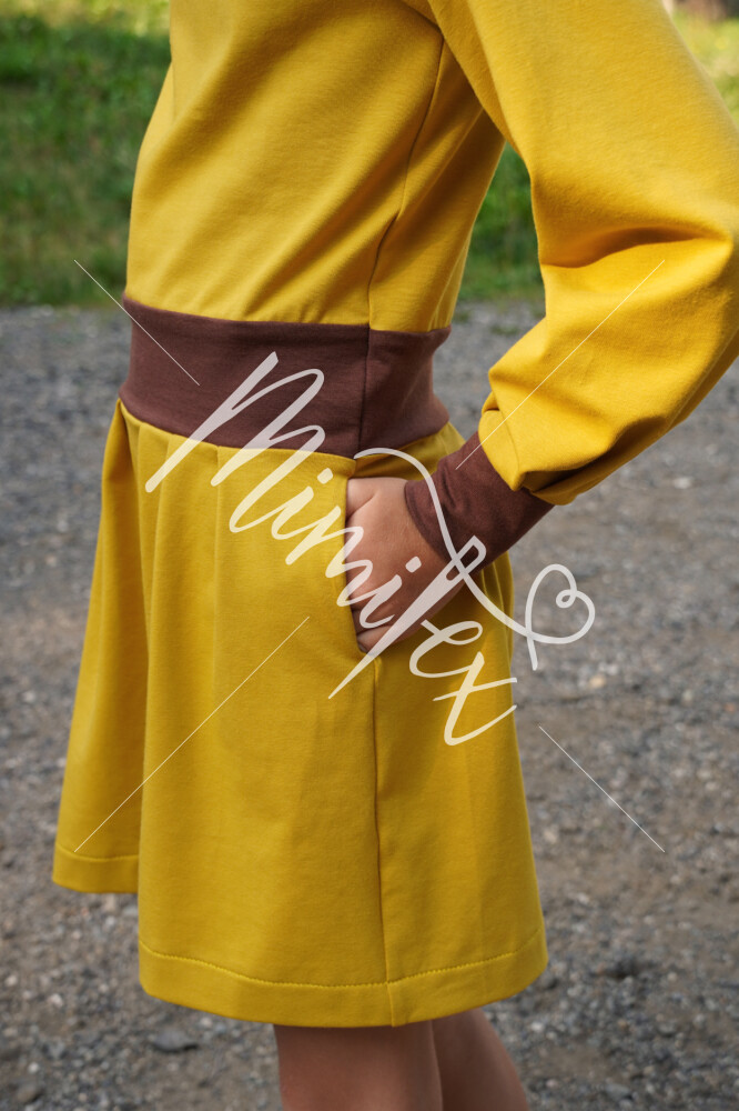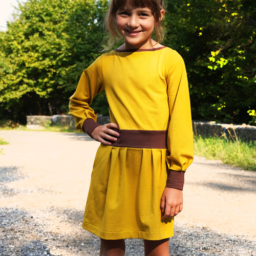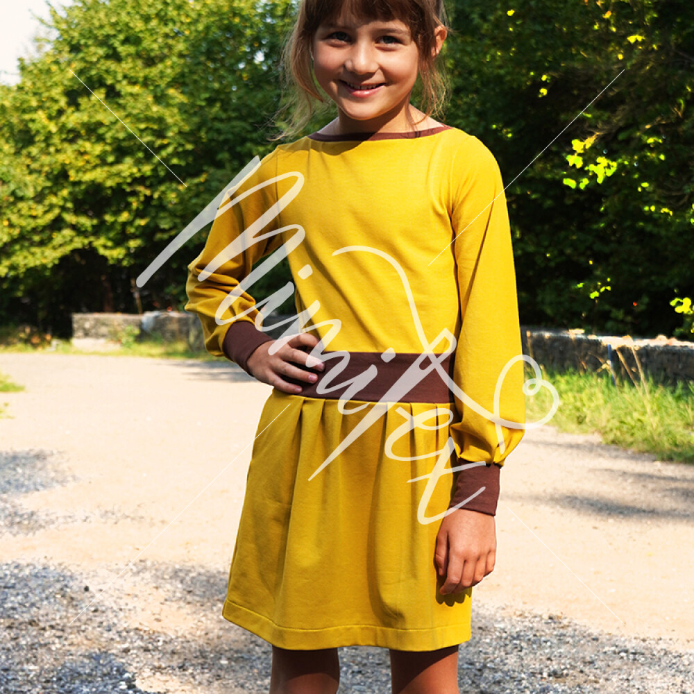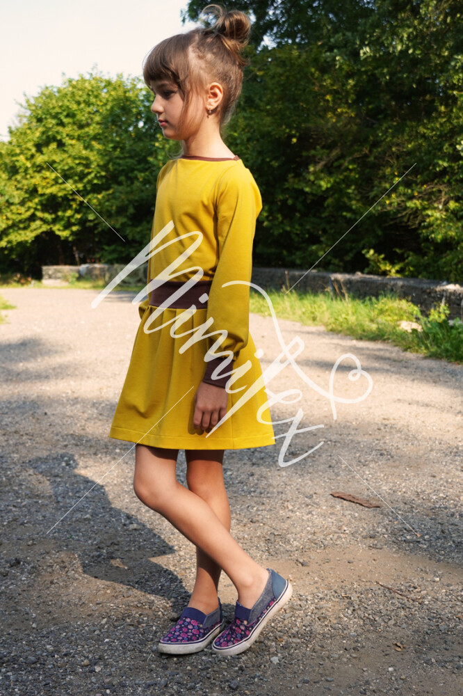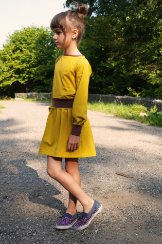 Střih na dětské šaty s kapsami, dlouhými rukávy a skládanou sukni je vypracovaný v profesionálním programu pro konstrukci střihů a je vyvedený ve velikostech 80–164.