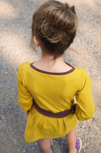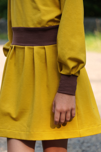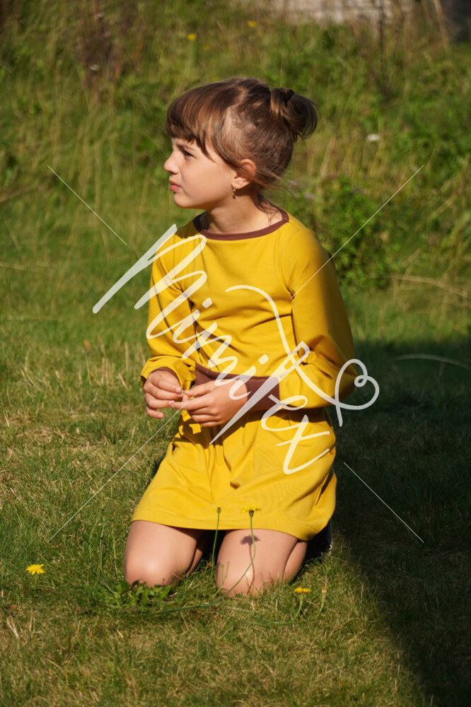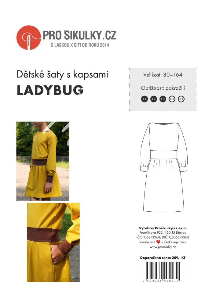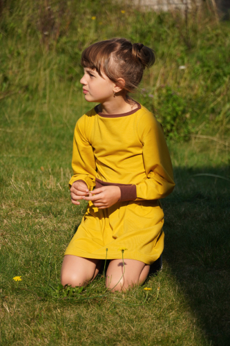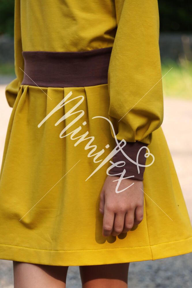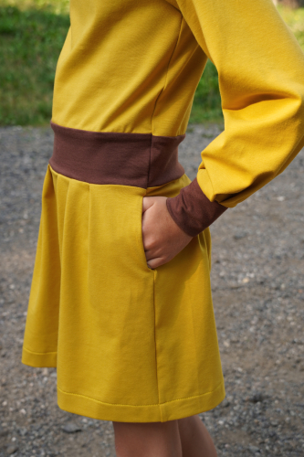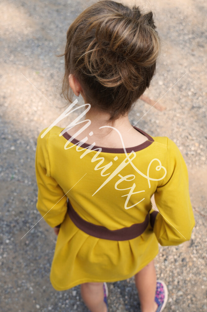 Střih na dětské šaty s kapsami, dlouhými rukávy a skládanou sukni je vypracovaný v profesionálním programu pro konstrukci střihů a je vyvedený ve velikostech 80–164.