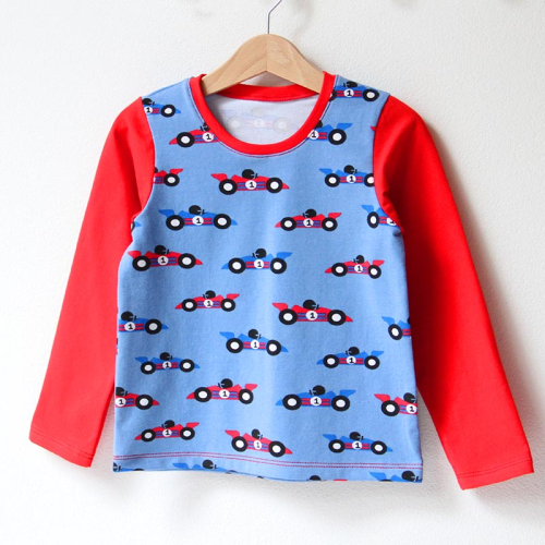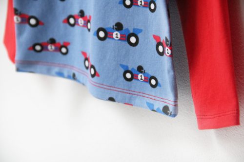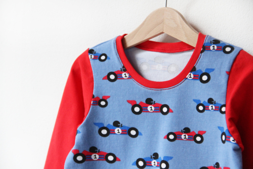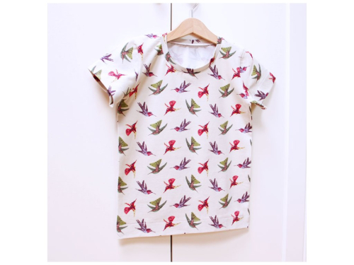 Tričko můžete šít na overlocku ale i na běžném šicím stroji. Pokud budete šít na domácím šicím stroji, doporučuji šít pružným stehem (úzkým cikcakem, tříkrokým rovnostehem apod.), aby se vám netrhaly švy. Také doporučuji snížit přítlak patky a lehce povolit napětí spodní nitě, pokud to váš šicí stroj při šití umožňuje
