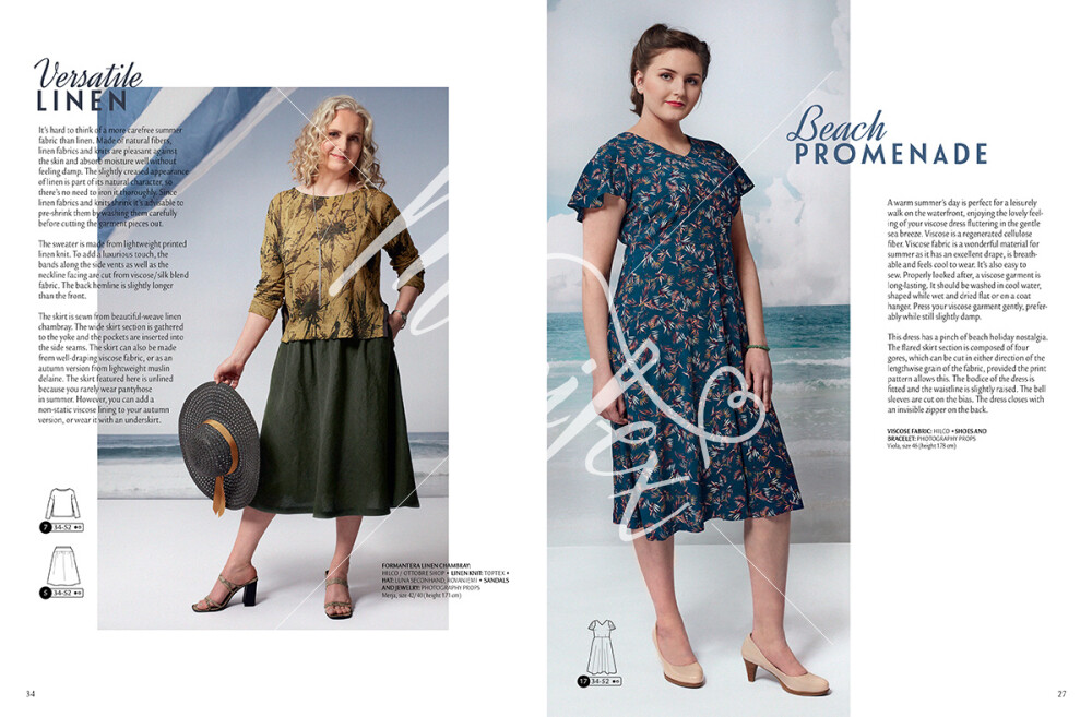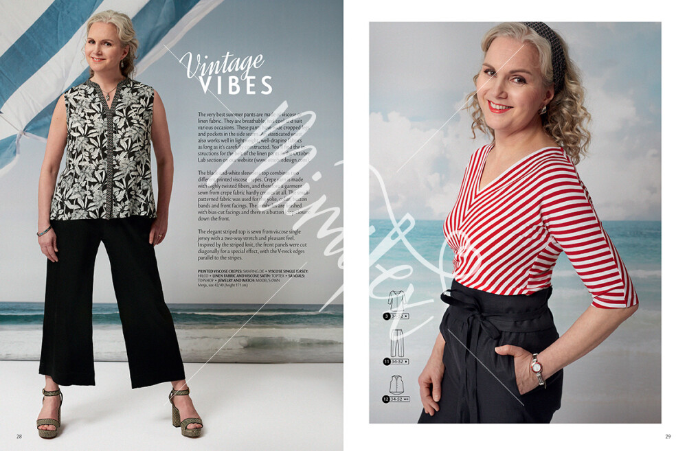 In addition to the blouses, there is also a superbly shaped shirt with batwing sleeves and, conversely, a loose-fitting shirt whose cut is versatile and only the choice of fabric decides for what purpose it will be worn. T-shirts and blouses are complemented by a selection of cuts for three trousers and two skirts.