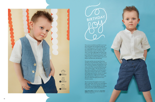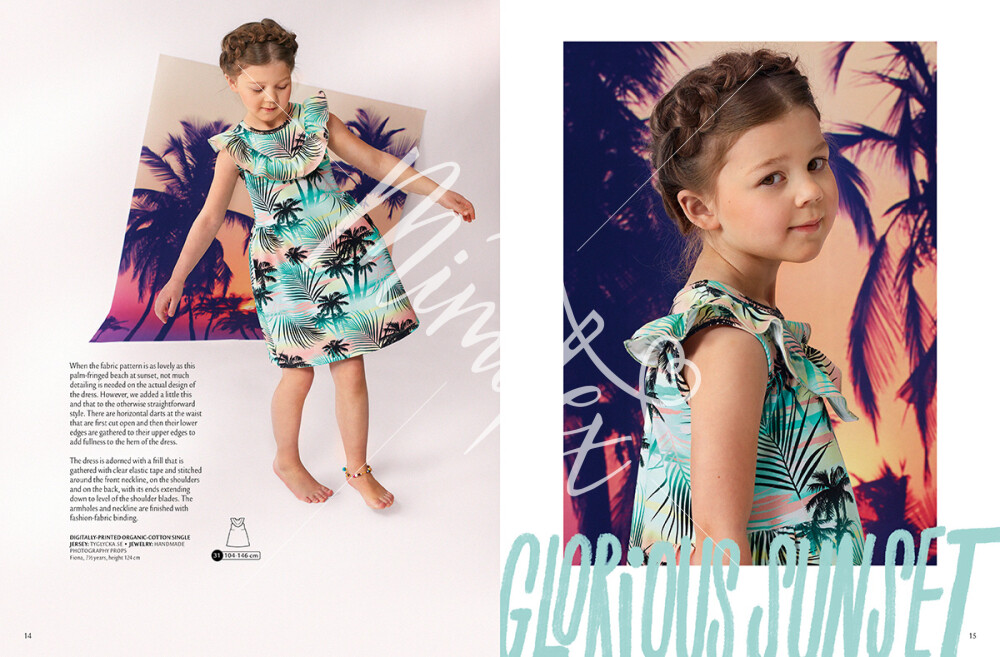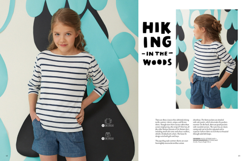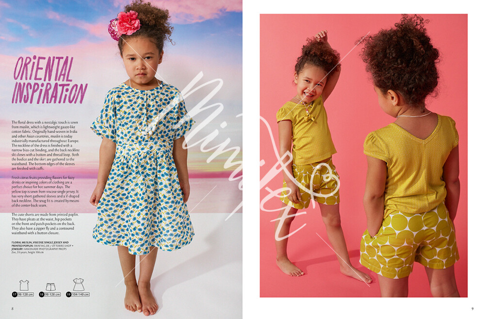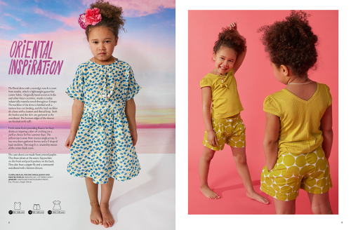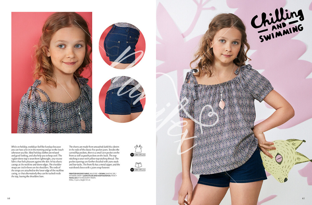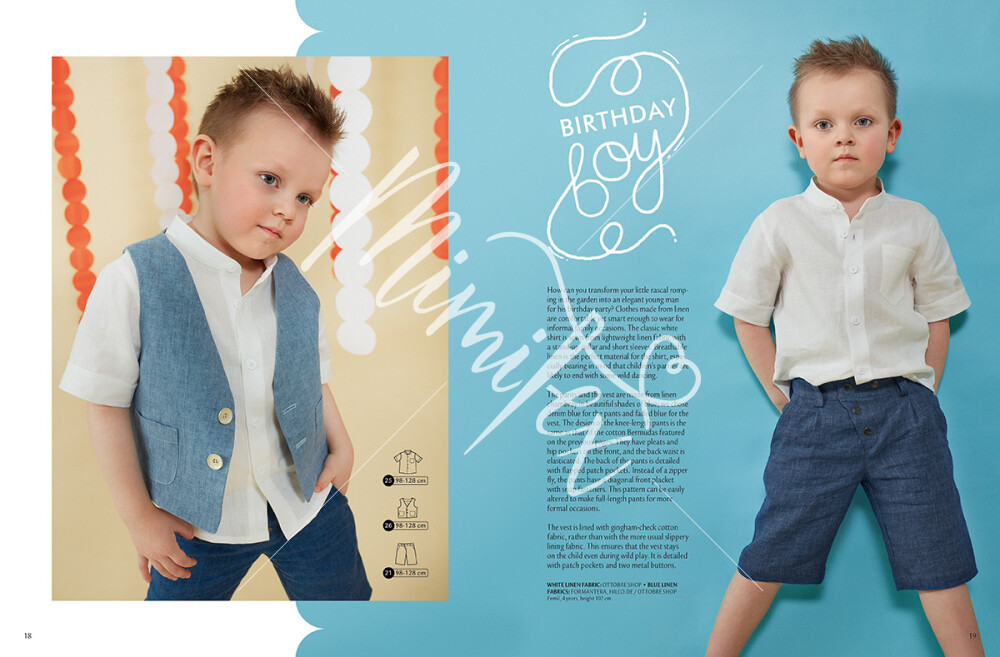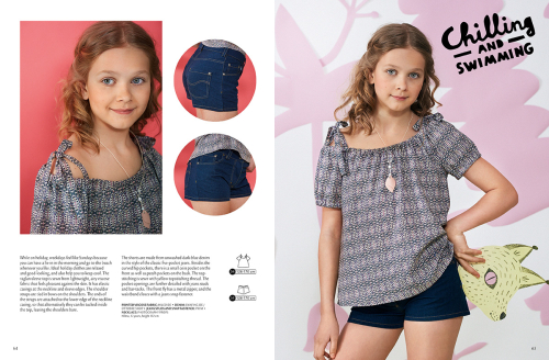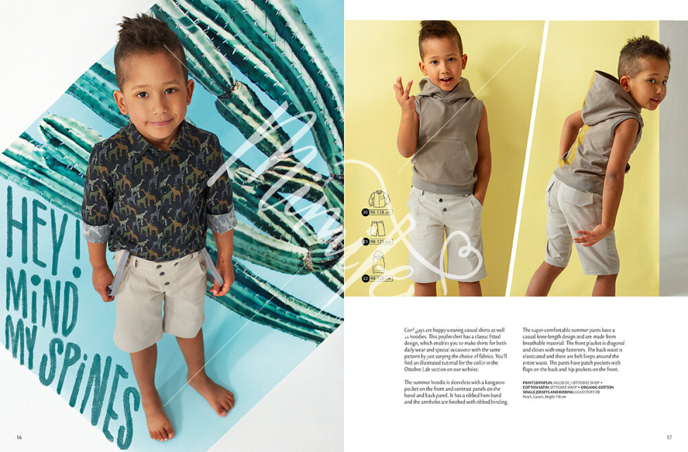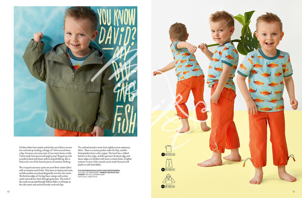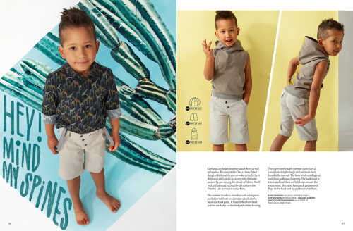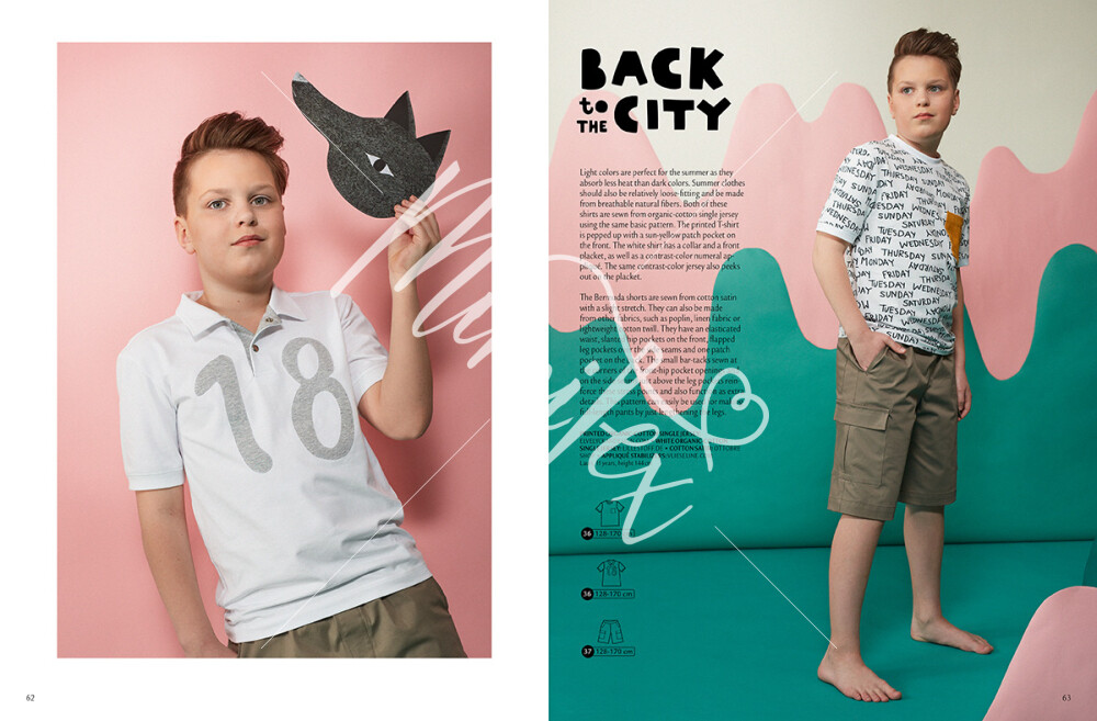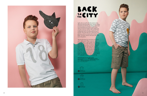 For kindergarteners and school kids The magazine features shirts, several versions of Bermuda shorts, dresses, girls' tops, t-shirts and a versatile vest, sweatshirt and pants.